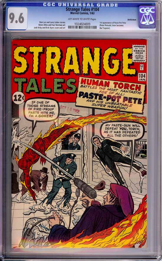 The best existing copy!!! It was the first 9.6 certified until 3 other graded 9.6's decided to join in on all the fun. From the incredible Bethlehem Collection, this copy is pure eye candy. The pages are an outstanding off-white to white, the centering is PERFECT, the edges and corners are razor sharp and the spine is legitimately immaculate. Plus, it is crazy glossy and the background reds will blow you away. Features the introduction of Paste-Pot Pete with a cool Jack Kirby/Dick Ayers cover. Contains the tell-tale date stamp on the front cover ("OCT 10 1962") that identifies this comic as being from the Bethlehem Collection.