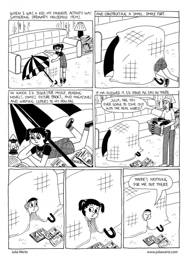 In “A Strange and Curious Place”, young Julia makes a fort in the living room and declares, upon poking her head out after her mother inquires after her, “There’s nothing for me out here.” She was happy to be in there with her books. Wertz goes into detail about an almost fetishistic love of books, down to the smell and feel of paper. Part of this is fueled by Wertz’s lifelong distaste for being a joiner; she wasn’t continually misanthropic, of course, but she never faked it to fill in. Once again, comics had a huge impact on her life, as she met dozens of cartoonists during a cross-country trip who wound up becoming life-long friends. In her comics, Wertz portrays the way she expresses her emotions as something mediated through various filters, like jokes with her brother. Comics became a filter with which she could develop close friendships built around a common passion, especially considering how bookish and introverted many cartoonists tend to be. Each of the three chapters ends with Wertz eventually expanding her range of relationships during different periods of her life, but there’s no question that she depicts herself as going from closed off to more open to opportunities in each story.