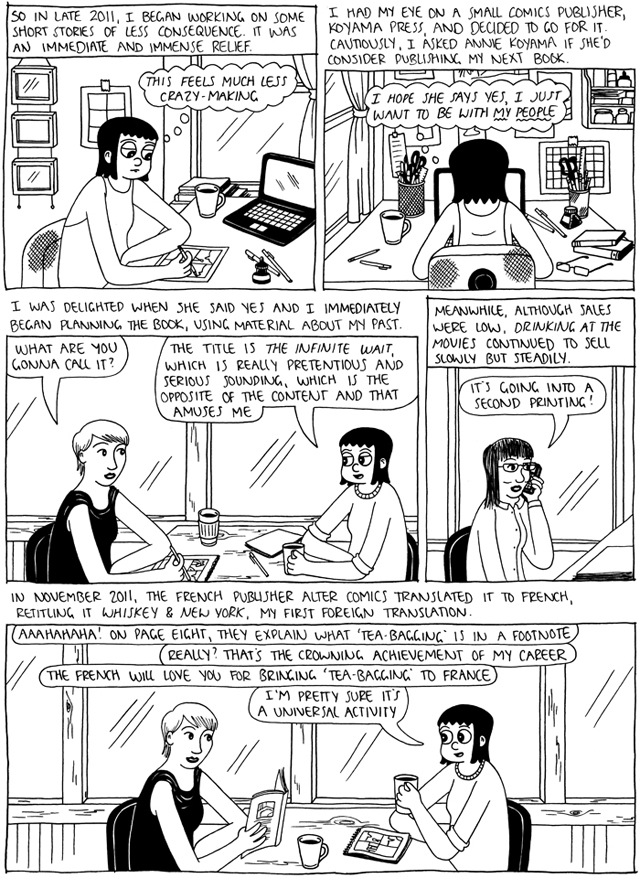 Underlying all of the funny business is the first mention of her alcoholism and how it started to affect her life. In a very matter-of-fact fashion, she relates how it cost her a couple of her jobs. The realization that she had no one to blame but herself for being fired is a dark moment, one made darker when she essentially skates right past it on her way to other jobs. It’s also balanced by her discovery of comics and the realization that she finally found what she really wanted to do after a lifetime of drifting and finding that she was good at something that wasn’t especially meaningful (waiting tables). Even as her drinking problem got worse before it got better (and Wertz notes that this is an ongoing battle), the fact that she could make a living off of doing comics and even be tempted by optioning her life story to Hollywood was an astonishing positive, one made all the more meaningful when she more fully came to terms with her problems.